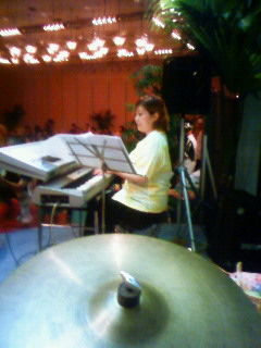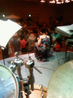 『ドラムの位置から撮ったので背中姿ですが…。この時、ヤクルトの容器で作ったハンドメイドのマラカスを子供達に配って、みんなでシャカシャカやってもらおうという狙い(^.^)b』
